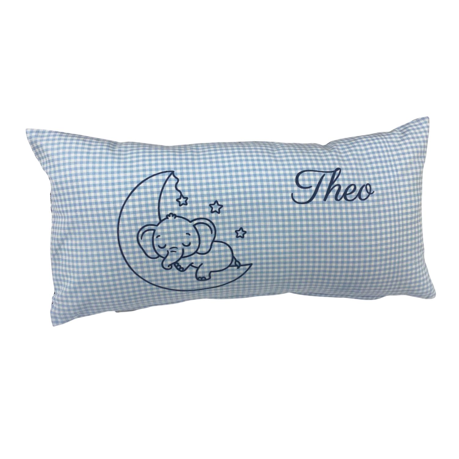 Personalisiertes Geschenk zur Geburt oder Taufe - Kuschelkissen mit schlafendem Elefanten auf dem Mond Willkommen auf der Welt, kleines Wunder! Dieses zauberhafte Kissen zur Geburt,Taufe oder zur Babyparty ist das perfekte Geschenk für einen kleinen Menschen, der unser Herz für immer berührt. Der Kissenbezug ist liebevoll handgefertigt aus hochwertigem Vichy-Stoff in zartem Hellblau oder Rosa und kann dank des Reißverschlusses jederzeit vom kuscheligen Innenkissen abgezogen und gewaschen werden. Der niedliche Teddy mit einem großen Herz in seinen Armen steht symbolisch für Wärme, Schutz und Liebe – ein starker, liebevoller Beschützer fürs Baby! Personalisiert mit dem Namen des Kindes ist das Kuschelkissen ein einzigartiges Erinnerungsstück, das Geborgenheit schenkt - im Kinderzimmer, auf Reisen, ein Leben lang!