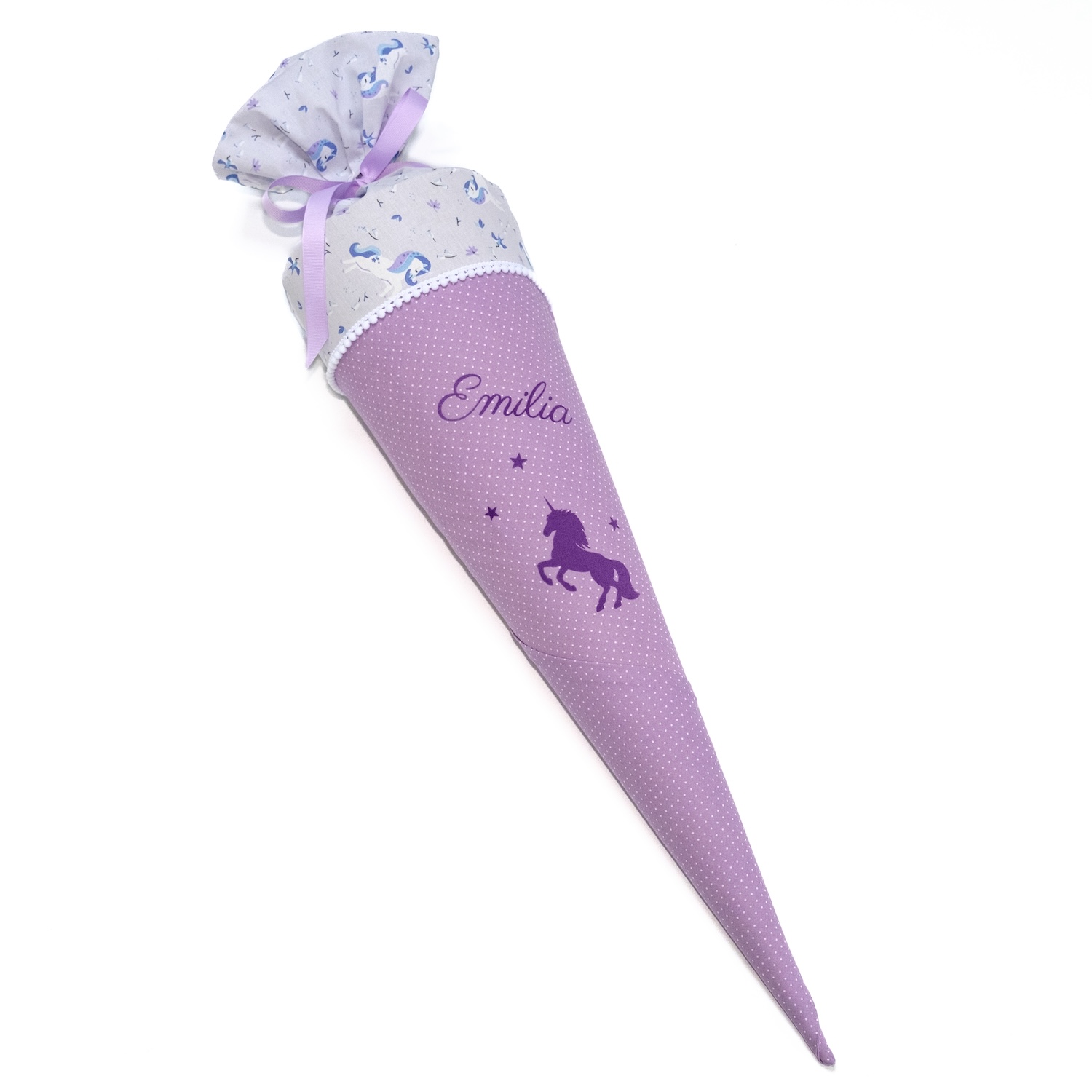 Willkommen in der Welt der Magie! Fröhliche Einhörner springen mit Blumen, Blättern und kleinen Vögelchen um die Wette. Ob ein weiteres Einhorn, wie auf dem Foto, oder ein anderes Motiv oder kein Motiv auf deiner Zuckertüte Platz finden soll, wählst du selbst aus! Einfach oben bei der Personalisierung deinen Wunschnamen, Datum und/oder Motiv angeben, und wir fertigen dir deine ganz persönliche Schultüte !