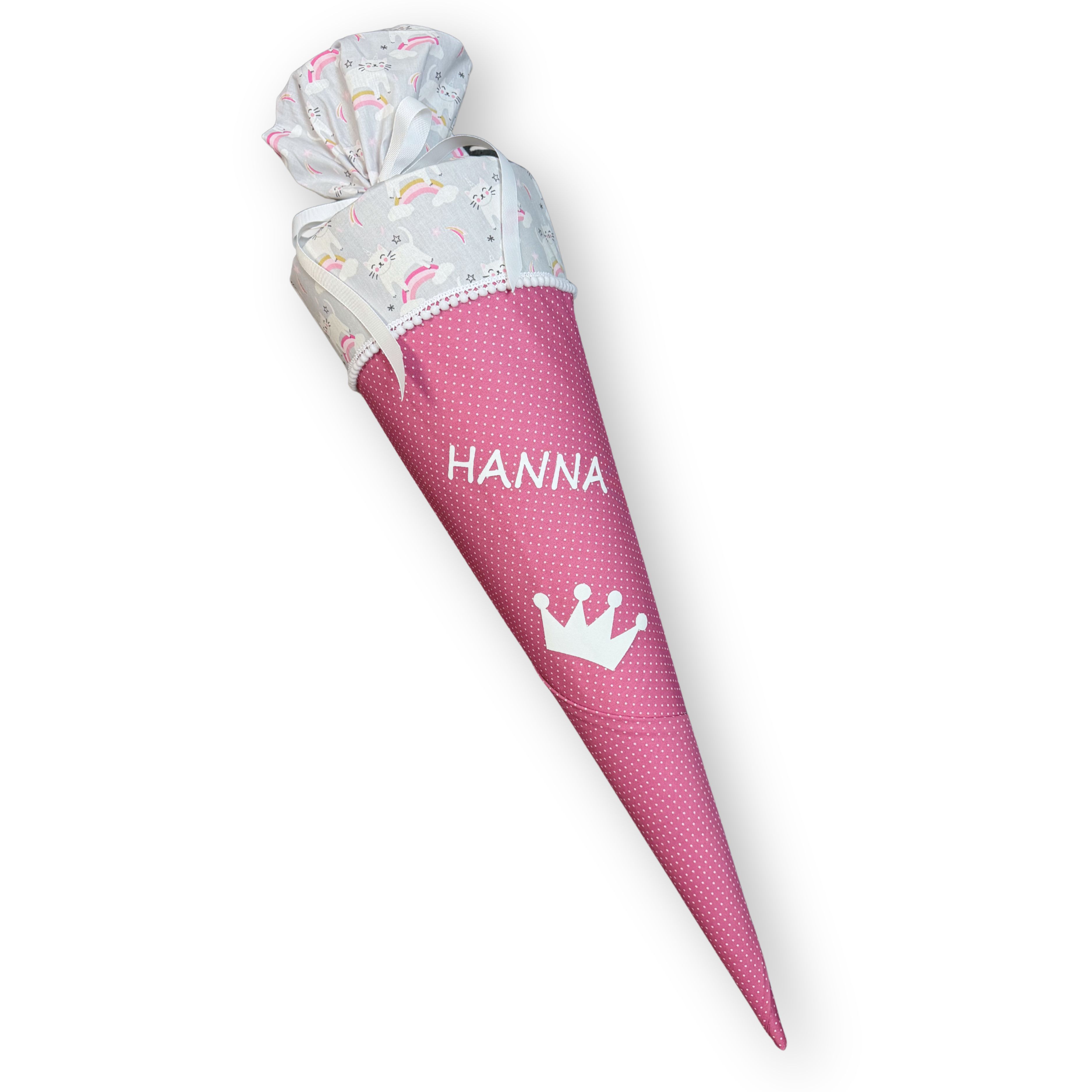 Für kleine Queens und Kings! Süße Kätzchen-EInhörner tanzen mit Regenbögen und Sternschnuppen um die Wette! Die hochwertigen Baumwollstoffe in Grau mit Motiven und Brombeerfarben mit weißen Pünktchen wurden kombiniert mit feinem weißen Pomponband. Statt der Krone kann auch jedes andere Motiv auf deinem Zauberkegel Platz finden, zum Beispiel ein Einhorn, Sterne, Katzen, Pferd oder Regenbogen. Mit deinem Namen und dem Einschulungsdatum wird diese Schultüte dein ganz persönliches Exemplar.