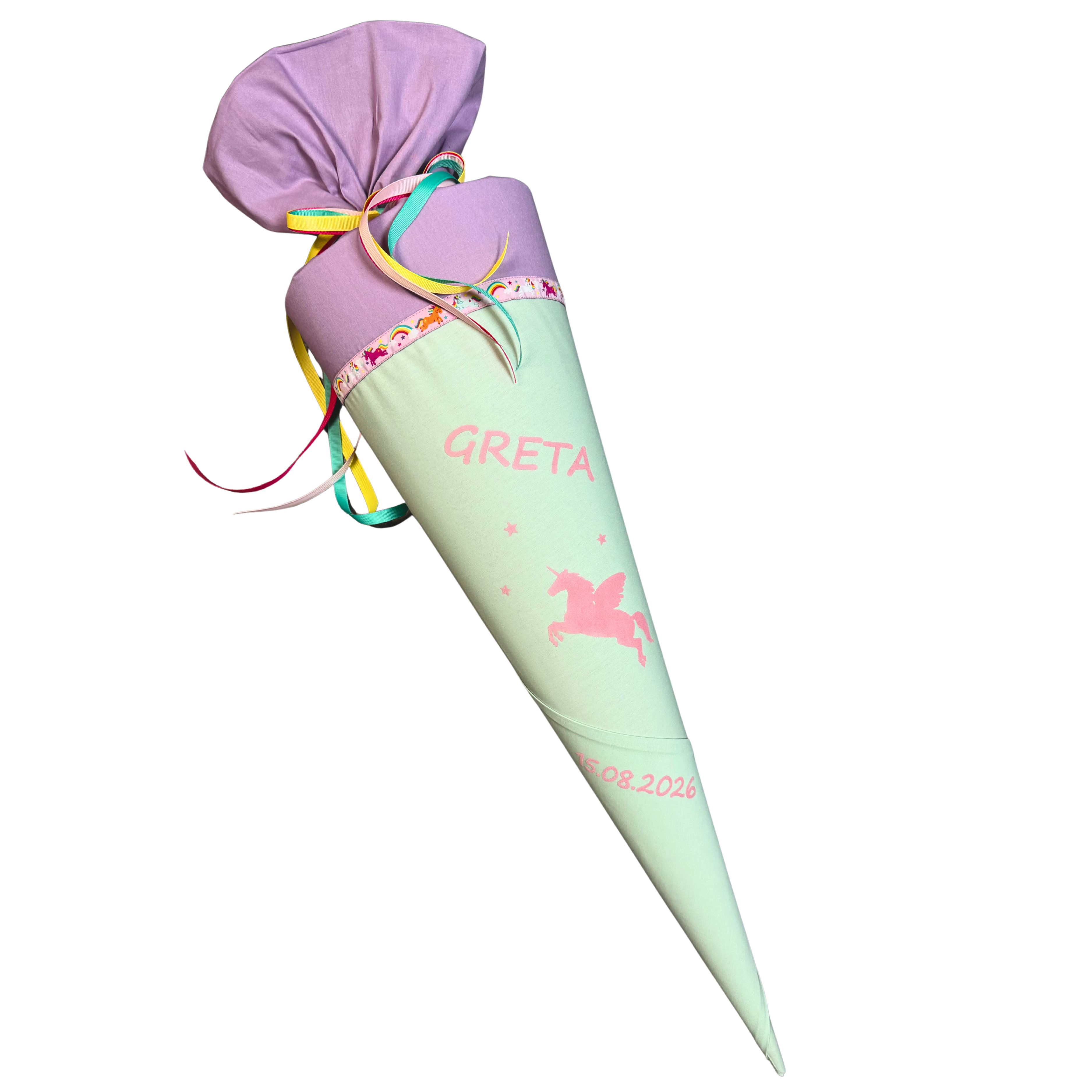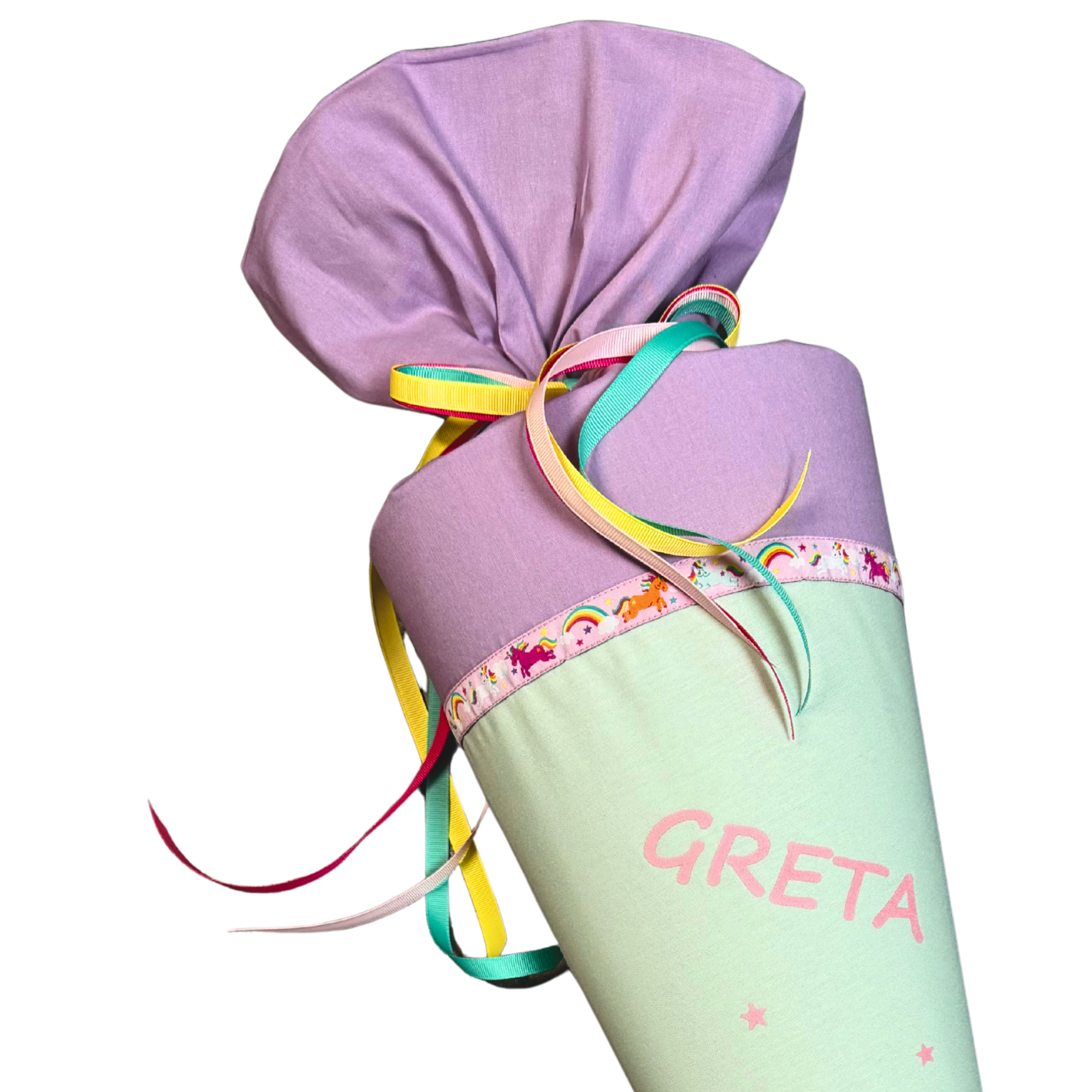 Lange auf eine bonbonfarbene Schultüte gewartet? Hier ist sie! Hochwertige Baumwollstoffe in Lila und Mint, kombiniert mit einem zuckersüßen Einhornband in Rosa mit Wölkchen und Regenbogen. Farblich passend zum Beispiel zu Schulranzen von Ergobag, Scout und School Mood. Auf der Zuckertüte auf dem Bild seht ihr ein Pegasus. Es kann aber auch ein Einhorn oder jedes andere unserer angebotenen Motive in verschiedenen Farben darauf Platz finden.Traumhaft für einen zauberschönen 1. Schultag! Und nach der Einschulung bleibt die Schultüte als kuscheliges Kissen und zauberhaftes Accessoire erhalten! Schau dir gern unser Video zur Umwandlung an.